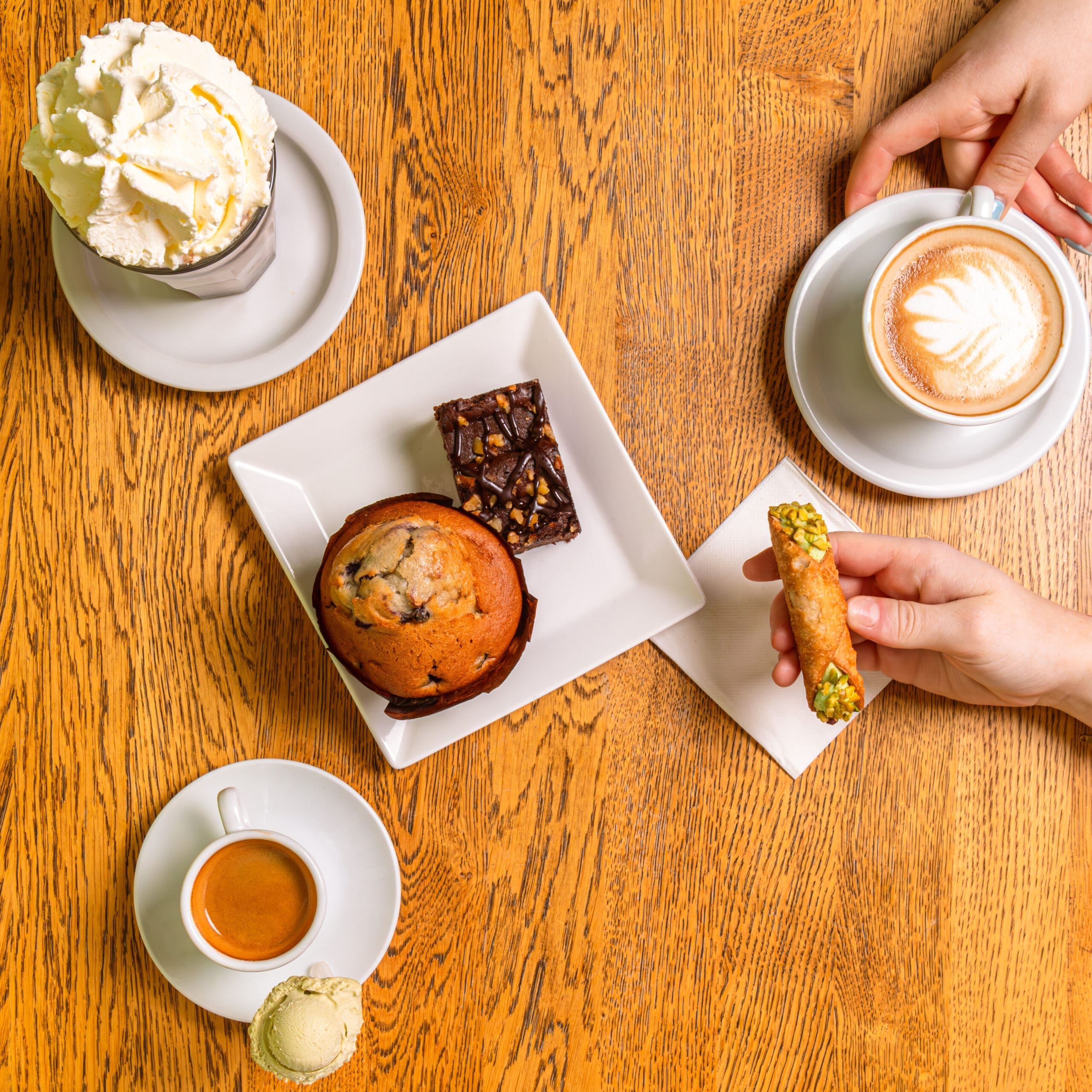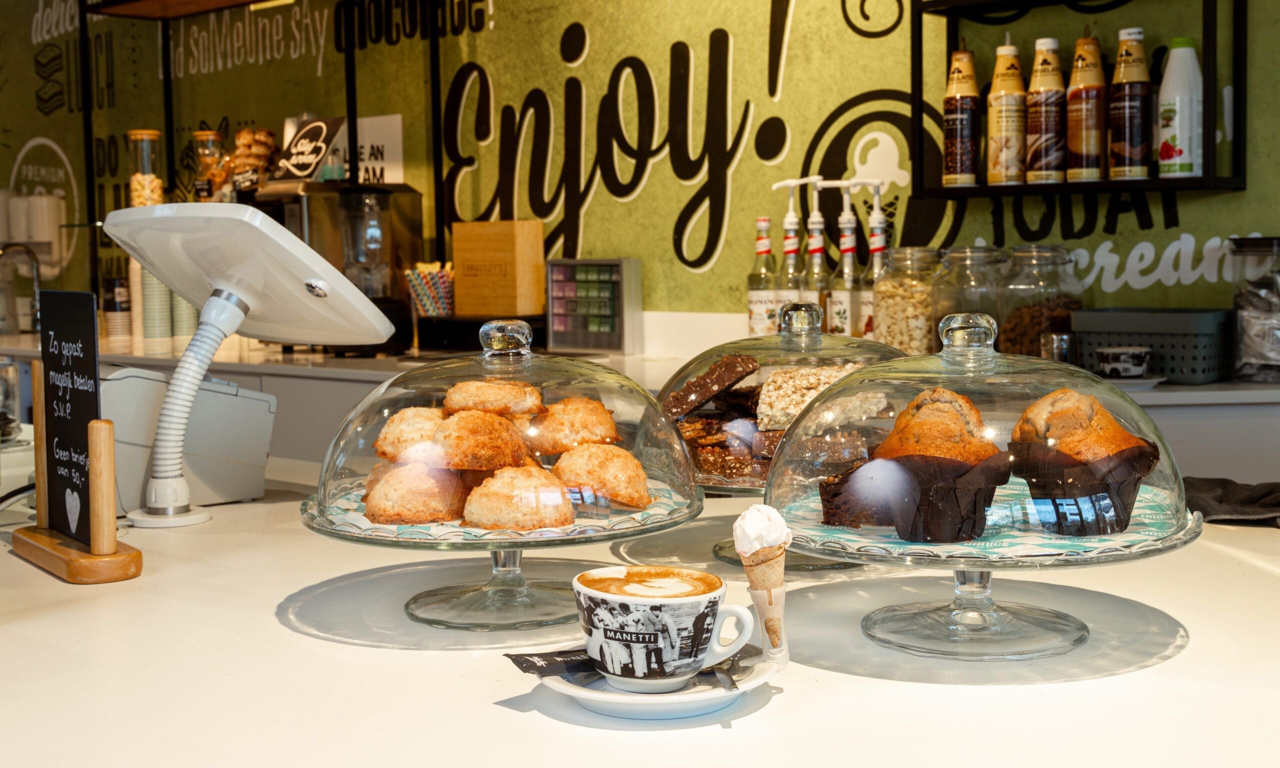Voor de echte zoetekauw is er altijd wat te kiezen: vers gebak, muffins, canolli’s en nog veel meer. Een extra genietmomentje bij een kop koffie of thee.
